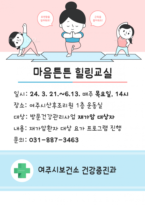 [금요저널] 여주시보건소는 관내 재가암 환자 등록자를 대상으로 3월 21일부터 6월 13일까지 매주 목요일 12주간 재가암환자관리 ‘마음튼튼 힐링교실’ 프로그램을 운영 할 예정이다.