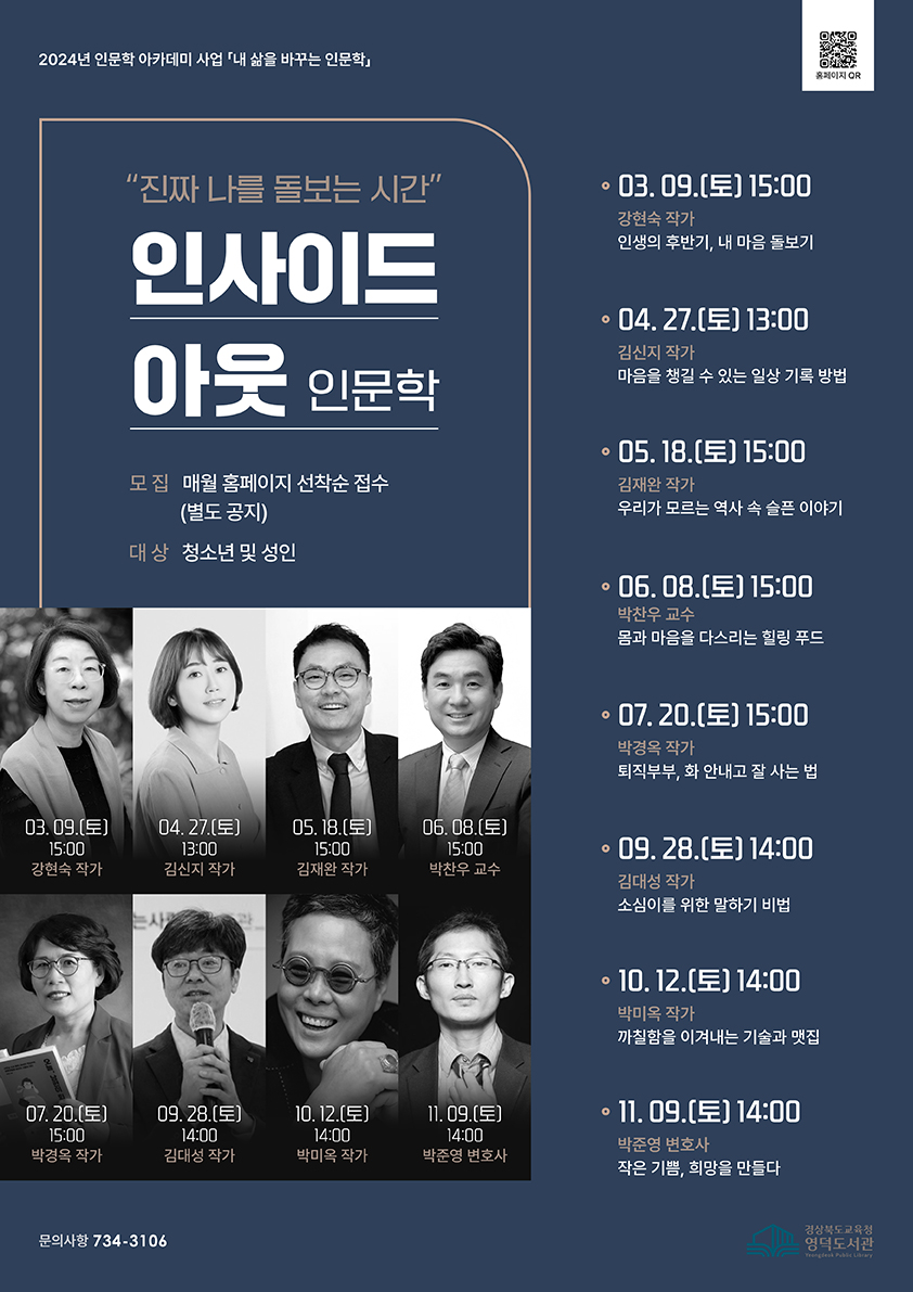 ‘인사이드 아웃 인문학’은 마음과 감정을 주제로 한 인문학 특강으로 오는 3월 9일 강현숙 작가의 ‘인생의 후반기, 내 마음 돌보기’강연을 시작으로 11월까지 운영된다. 슬픔, 분노, 소심, 기쁨 등 다양한 주제를 선정하여 각 분야의 저명한 작가, 교수, 변호사등을 초청하여 진행될 예정이다.