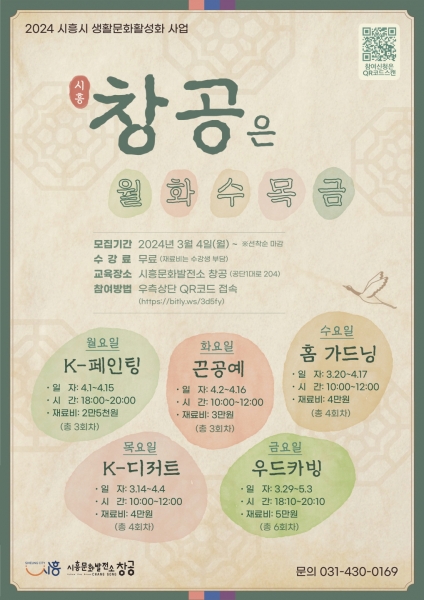 [금요저널] 시흥시는 오는 3월 14일부터 5월 3일까지 시흥문화발전소 창공에서 2024 상반기 생활문화 교육 프로그램인 ‘창공은 월화수목금’을 운영한다.