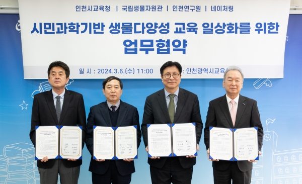[금요저널] 인천광역시교육청은 기후 위기 공동 대응을 위해 국립생물자원관, 인천연구원, 주식회사 네이처링과 생물다양성교육 일상화를 위한 업무협약을 6일 체결했다.