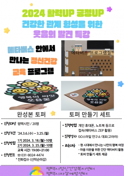 [금요저널] 평택시 정신건강복지센터에서는 시민들의 ‘비대면 정신건강 서비스’에 대한 높은 수요도를 충족시키기 위해 비대면 메타버스 정신건강 프로그램인 ‘2024 활력 UP 긍정 UP’을 진행한다고 밝혔다.