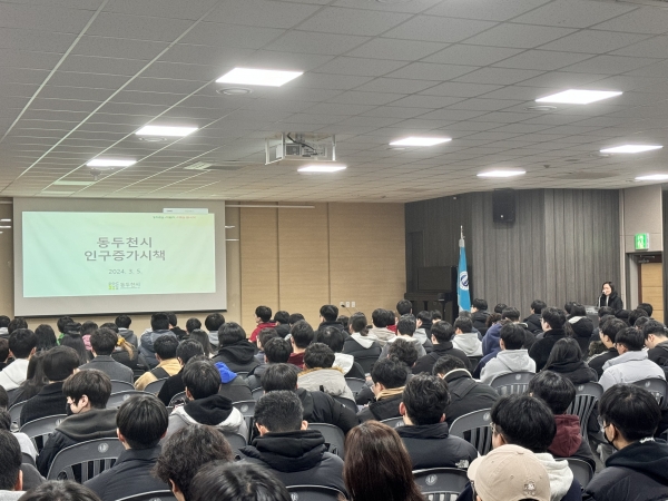 [금요저널] 동두천시는 인구 증가 시책 지원 사업에 대한 홍보를 위해 3월 5일과 6일 이틀간 동양대학교 동두천 캠퍼스 대강당에서 2024년도 신·편입생 600여명을 대상으로 설명회를 개최했다.