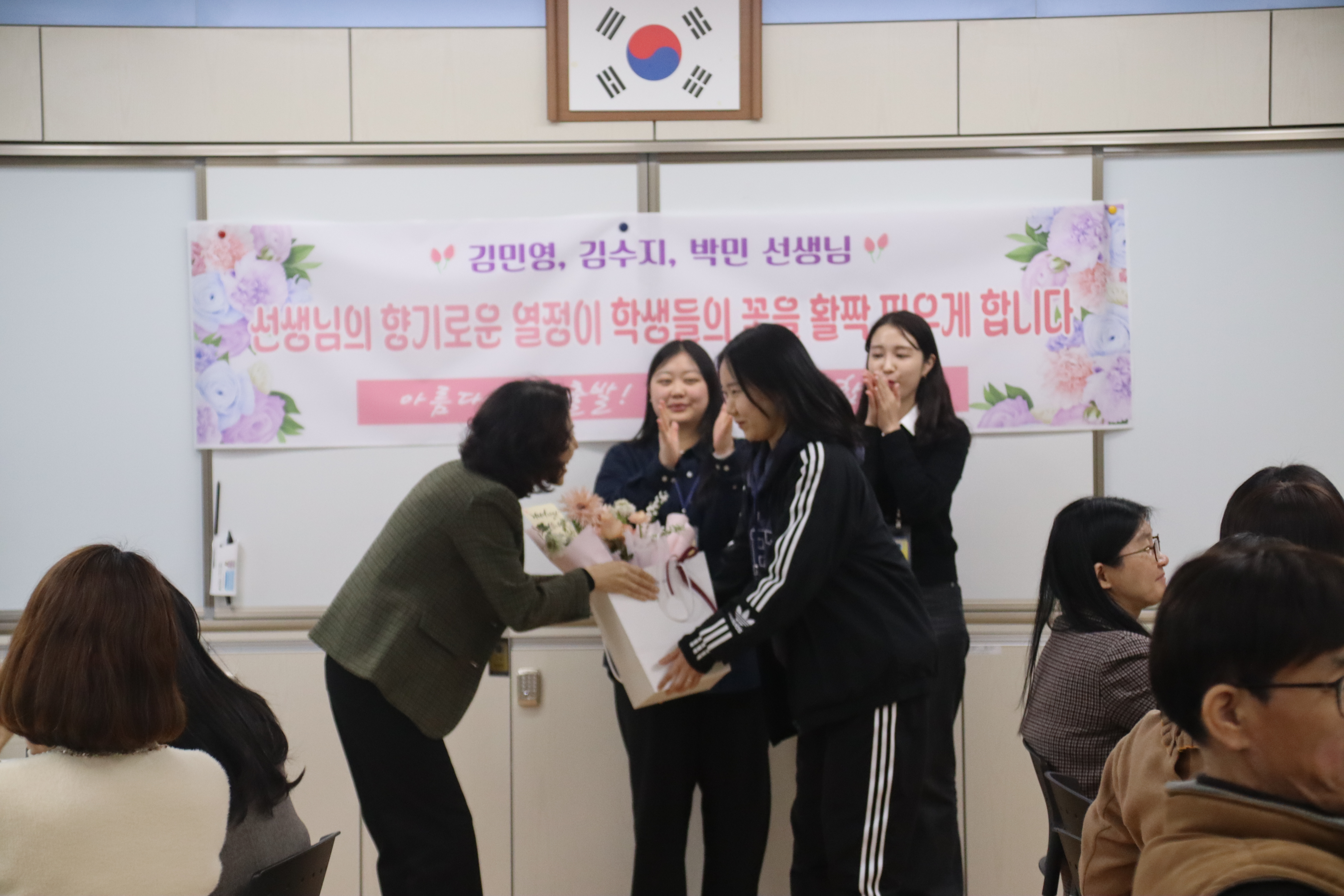 □ 이날 행사는 ‘ 선생님의 향기로운 열정이 학생들의 꽃을 확짝 피우게 합니다’라는 선배 교사들이 교직 첫걸음을 떼는 신규 후배 교사들의 새 출발을 응원하기 위해 마련된 자리였다. 후배들을 응원하며 함께 힘을 얻어 아이들을 위한 열정을 북돋워 주는 의미 있는 시간을 가졌다.