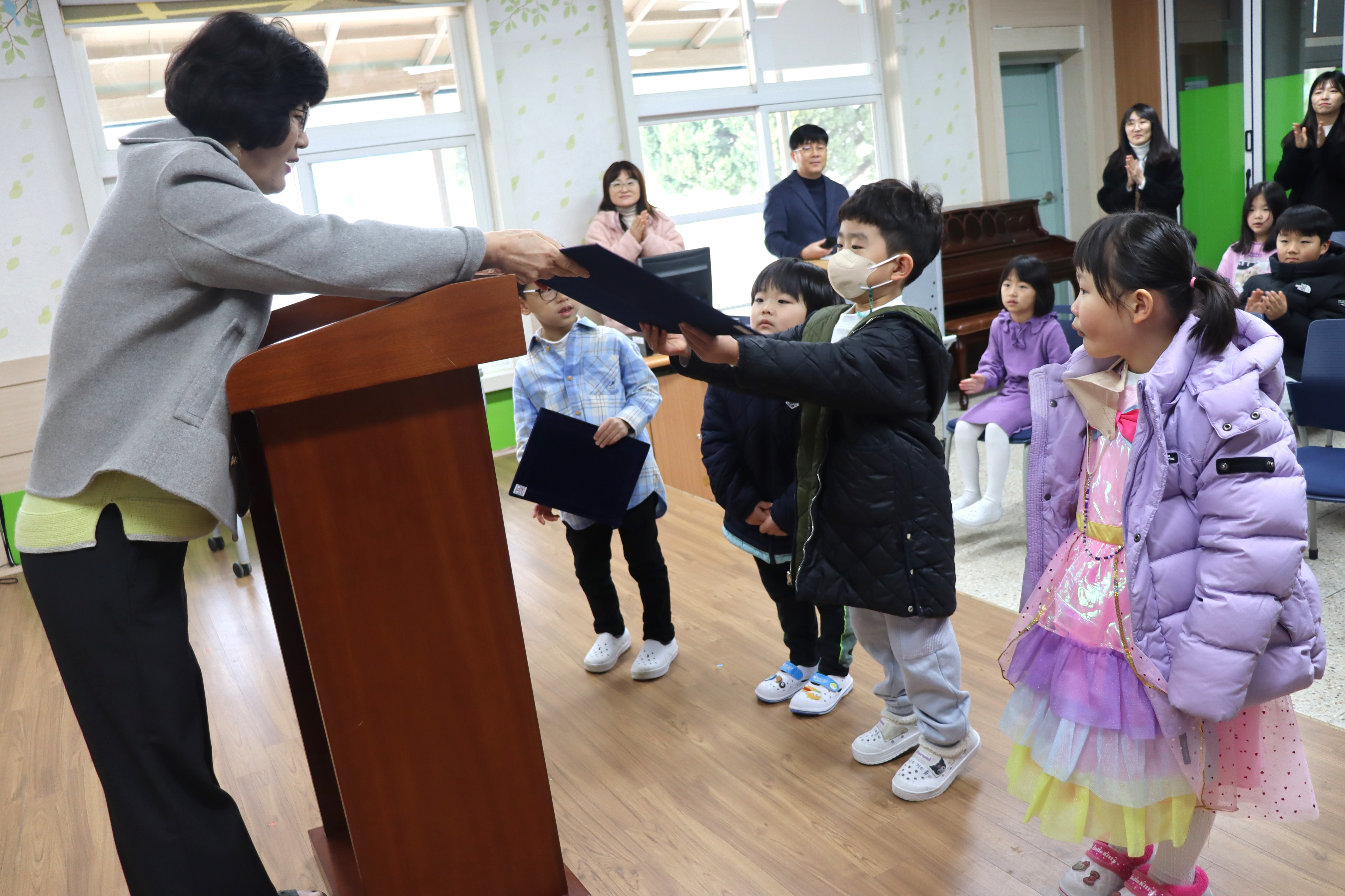 입학생에게는 씩씩하고 건강하게 자라길 바라는 의미로 체육복과 탁구라켓을, 예쁘고 아름다운 마음을 가지길 바라는 의미로 우쿨렐레와 오카리나를 선물로 주었다.