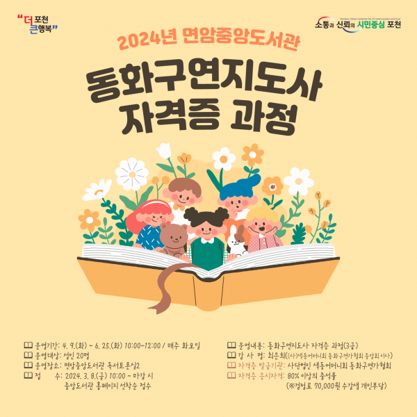 [금요저널] 포천시는 오는 8일부터 면암중앙도서관에서 독서 문화 활성화를 위한 동화구연지도사 자격증 과정을 운영한다.