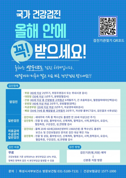검진 대상자 여부는 화성시서부보건소 보건정책과 방문보건팀 또는 건강보험공단으로 문의하면 확인할 수 있다.