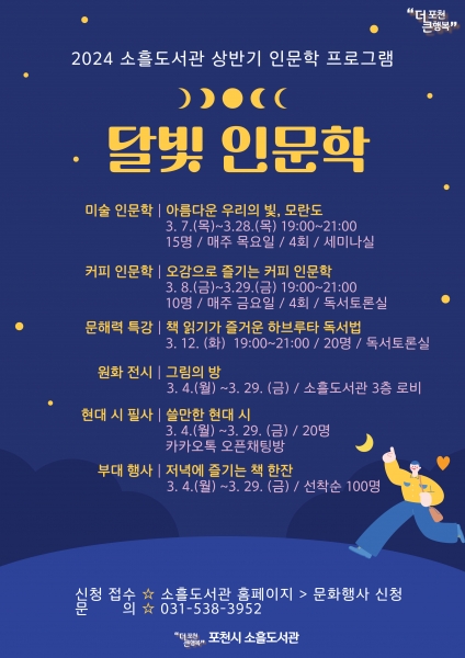 [금요저널] 포천시는 오는 31일까지 소흘도서관에서 야간에도 인문학을 즐길 수 있는 ‘달빛 인문학’ 프로그램을 운영한다.