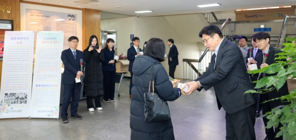 도성훈 교육감은 이날 청사 1층에서 출근하는 직원들에게 세계 여성의 날을 축하하는 편지를 담은 쿠키와 장미꽃을 직접 나눠주며 인사했다.