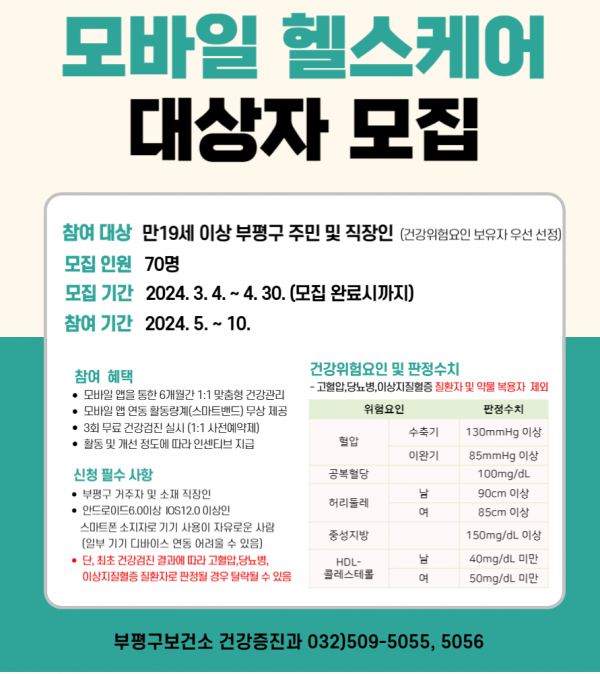 [금요저널] 부평구 보건소는 ‘2024년 모바일 헬스케어 사업’에 참여할 지역주민 70명을 다음 달 30일까지 선착순으로 모집한다.