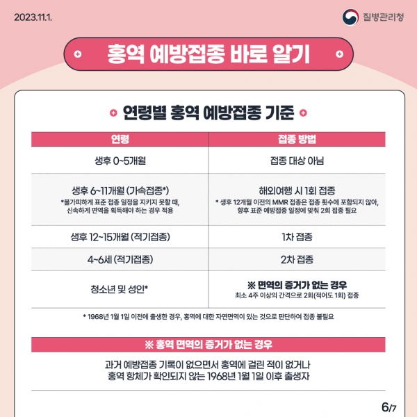 홍역은 공기로 전파되는 호흡기 감염병으로 감염 시 발열, 발진, 구강 내 회백색 반점이 나타나는 전파력이 매우 높은 감염병이지만 예방 접종으로 충분히 예방이 가능한 감염병이다.