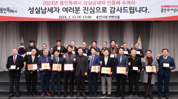 이상일 용인특례시장은 이날 성실납세자로 선정된 개인 12명에게 인증패를 전달하고 법인과·기업 10곳에는 인증 현판을 전달하고 격려했다.
