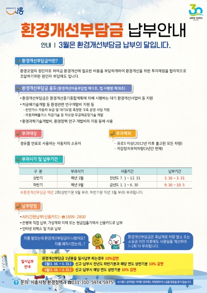 환경개선부담금은 환경개선사업의 투자재원으로 활용된다고 강조한 시 관계자는 “환경개선부담금을 1월 중 일시납부할 경우 전년도 하반기분과 해당 연도 상반기분 10% 감면, 3월 중 일시납부할 경우 해당 연도 상반기분에 대해 10%를 감면받을 수 있다”며 시민들이 납부 기간 내에 적극적으로 납부해줄 것을 당부했다.