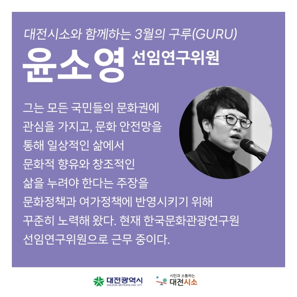3월의 프로그램에선 한국문화관광연구원의 윤소영 선임연구위원이 교육을 주도할 예정이다. 윤소영 전문가는 문화 안전망을 통해 시민이 일상적인 삶에서 문화적 향유와 창조적인 삶을 누려야 하고 이를 문화 및 여가정책에 반영해야 한다고 꾸준히 주장해 왔다.