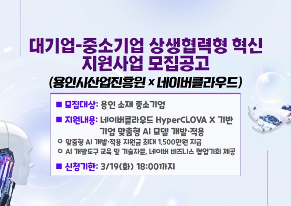 올해 처음 추진하는 이 사업은 인공지능·클라우드 분야 전문기업인 ‘네이버클라우드’와 함께 AI 분야의 기업을 지원할 예정으로 양 기관은 용인시 인공지능 산업 발전과 기업지원 협력을 위해 지난 2월 23일 업무협약을 체결했다.