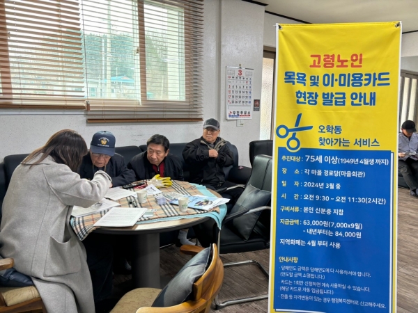 [금요저널] 오학동은 11일부터 천송1통 경로당을 시작으로 마을별 경로당을 찾아가 “고령노인 목욕 및 이미용카드 발급” 서비스를 추진한다.