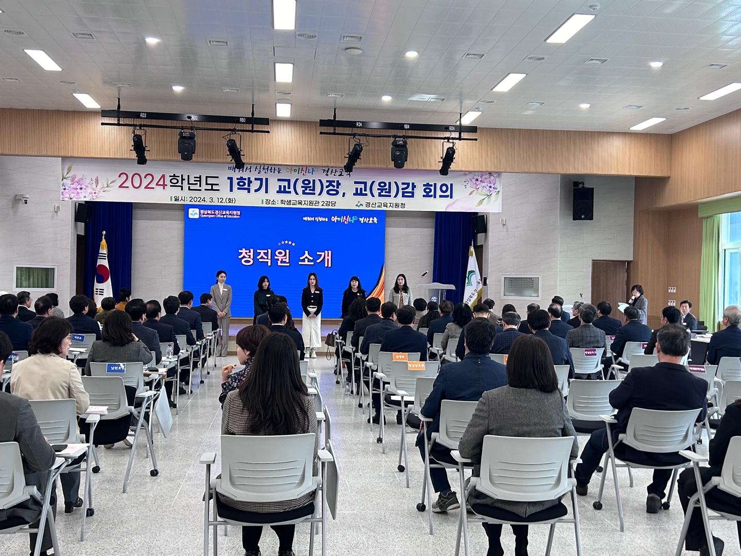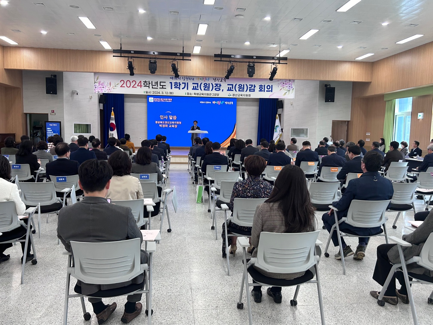 □ 경상북도경산교육지원청(교육장 박경화)은 3월 12일(화) 오전 10시 30분에 경산학생교육지원관 강당에서 관내 공립유치원 원장과 초, 중, 고, 특수학교 교장을 대상으로 신학년도 1학기 학교장 회의를 개최하였다.