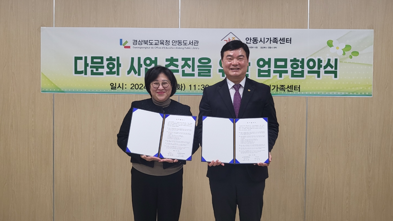 □ 경상북도교육청 안동도서관(관장 권오규)은 3월 12일(화) 11시 안동시가족센터와 다문화가족 지원 사업을 위한 업무협약을 체결하였다.