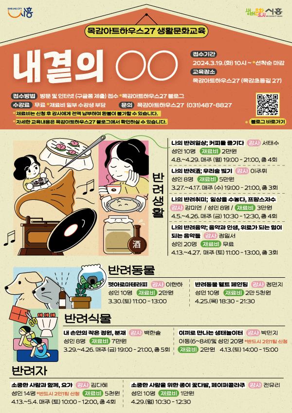 [금요저널] 시흥시는 목감아트하우스27에서 진행되는 2024년 상반기 생활문화교육 ‘내 곁의 OO’ 참여자를 3월 19일부터 모집한다.