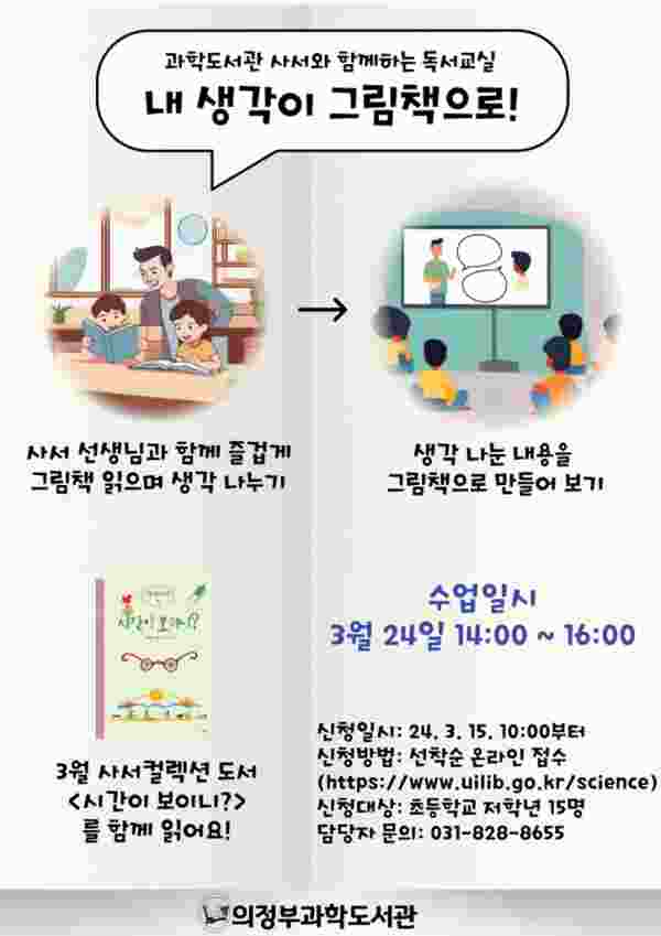 [금요저널] 의정부과학도서관은 초등학생 1~3학년 15명을 대상으로 사서와 함께 하는 독서교실 ‘내 생각이 그림책으로’ 프로그램을 3월 24일 운영한다.