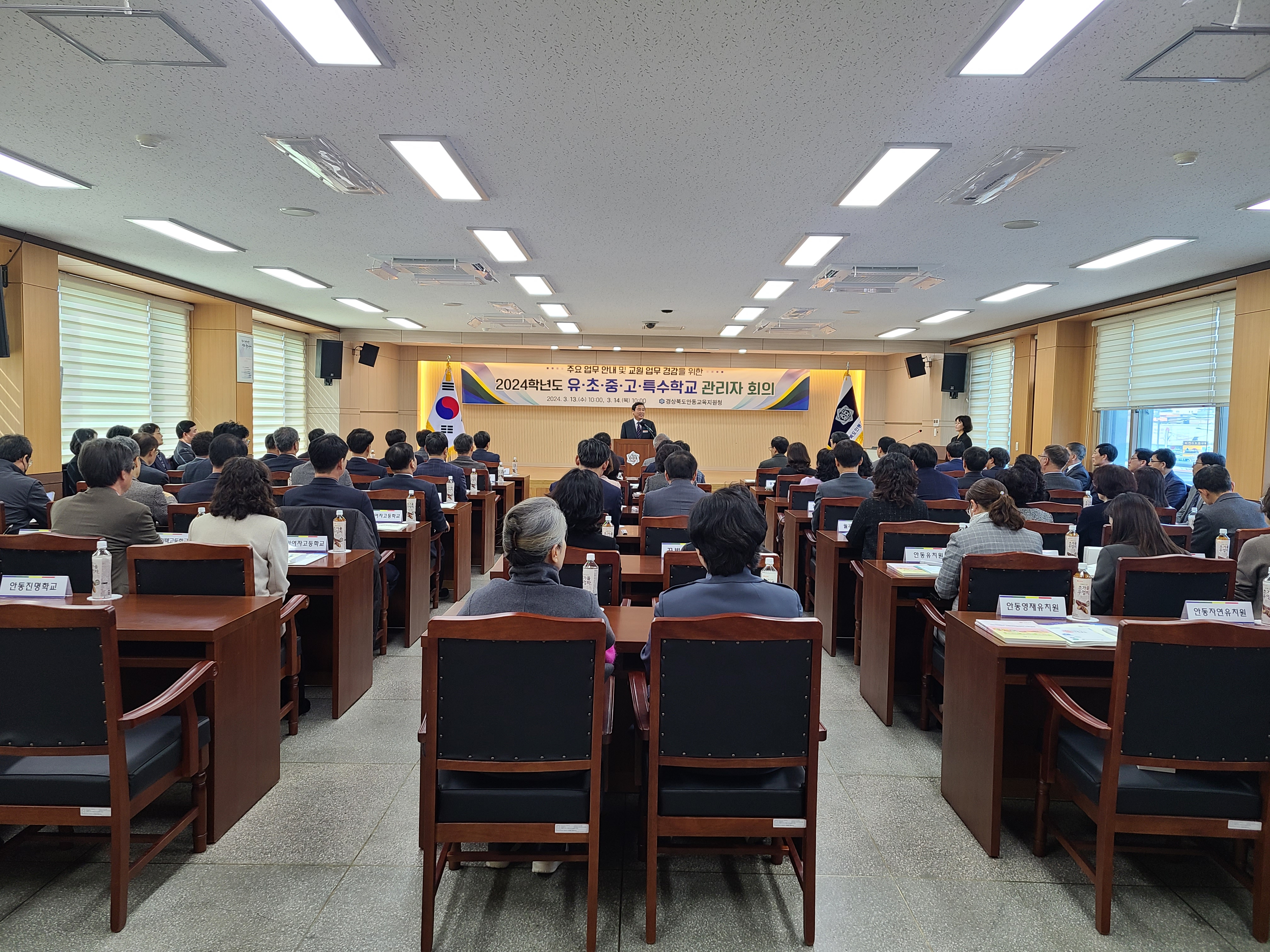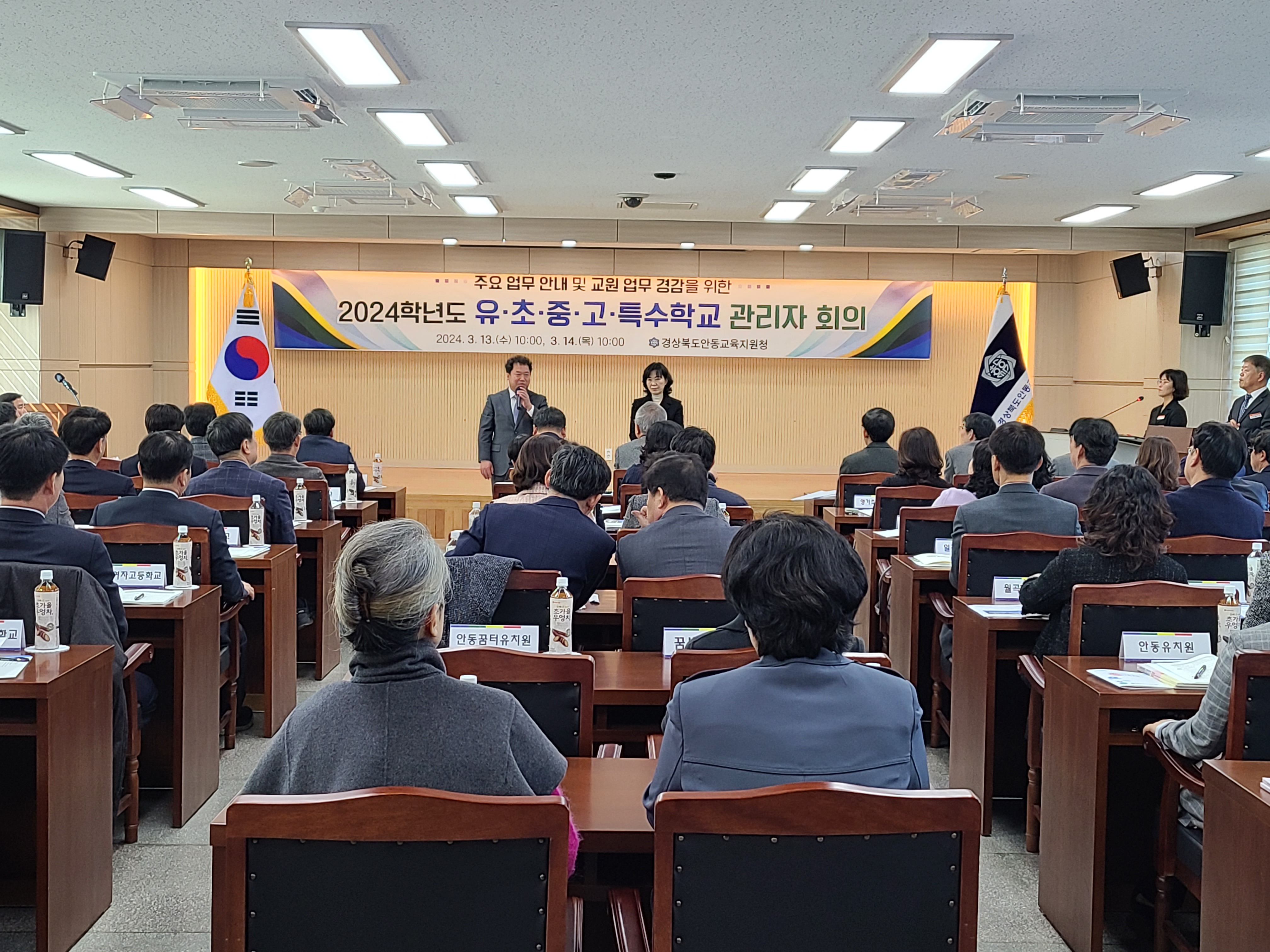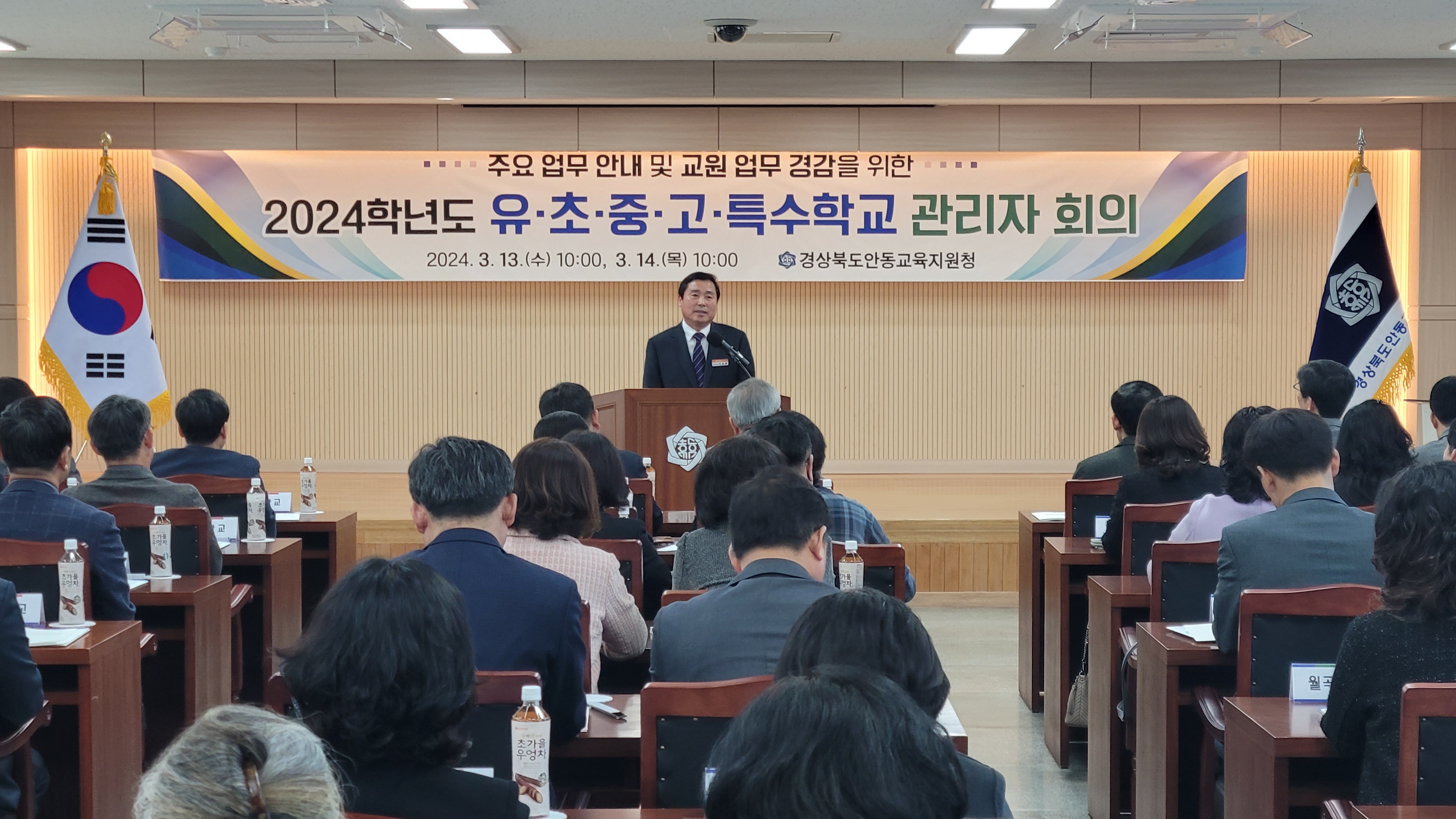 경상북도안동교육지원청(교육장 안중환)은 3월 14일과 15일 양일에 걸쳐 관내 유, 초, 중, 고, 특수학교 교(원)장, 교(원)감 130명을 대상으로 2024학년도 ‘전통과 미래를 잇는 새희망 안동교육’ 실현을 위한 3월 회의를 개최했다.