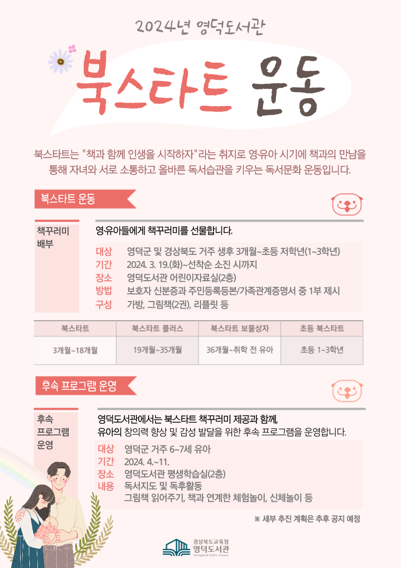 □ 경상북도교육청 영덕도서관(관장 안상기)은 오는 3월 19일부터 영덕군 및 경상북도에 거주하는 생후 3개월~초등 저학년(1~3학년)을 대상으로 북스타트 책꾸러미를 배부한다.