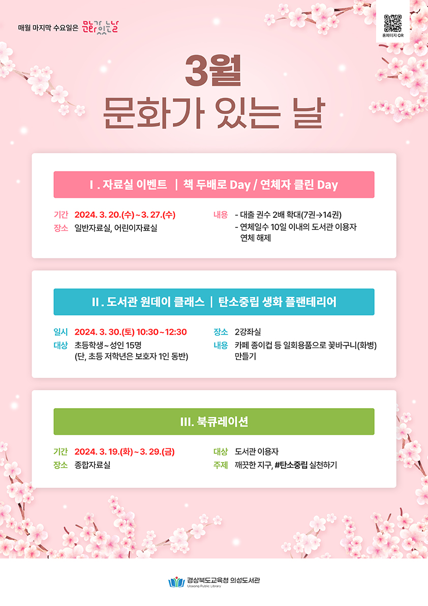 □ 이 밖에도 도서 두배로 대출, 연체 해제, 북큐레이션 등 의성도서관에서는 매월 마지막 주 다양한 문화가 있는 날 행사를 운영한다. 자세한 내용 및 참가 신청은 의성도서관 누리집(https://www.gbelib.kr/us)을 참고하거나 전화(☏834-7918)로 문의하면 된다.