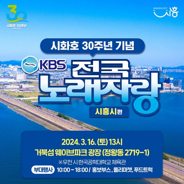 [금요저널] 시흥시는 3월 16일 오후 1시에 거북섬 웨이브파크 광장에서 시화호 30주년 기념 KBS 전국노래자랑을 개최한다고 밝혔다.