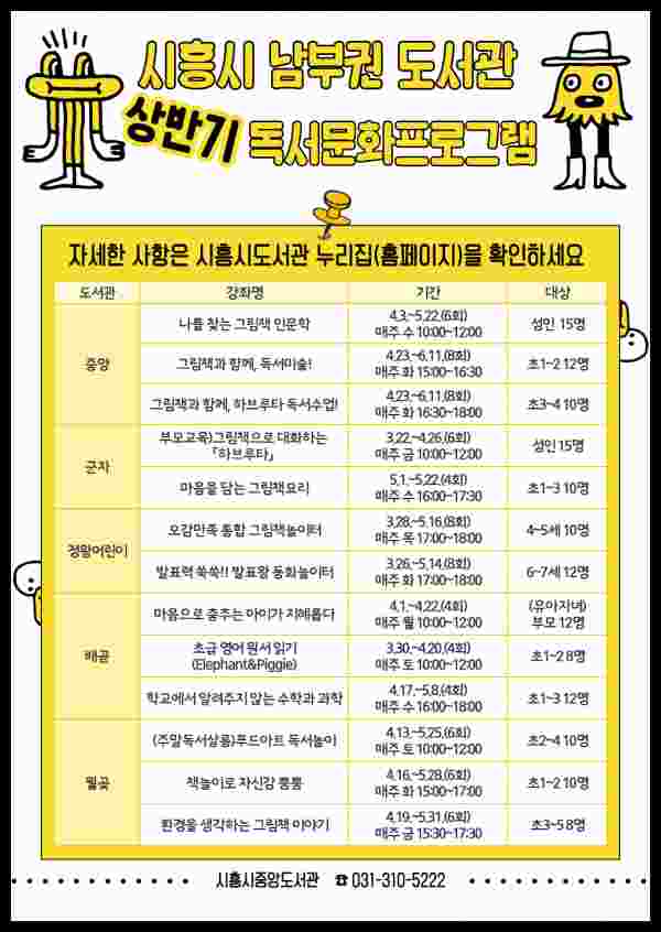 중앙도서관을 비롯한 남부권 4개 공공도서관에서 진행되는 상반기 독서문화 프로그램은 시민의 독서력 향상과 문화 체험 기회 확대를 위해 다채롭게 구성돼 있다.