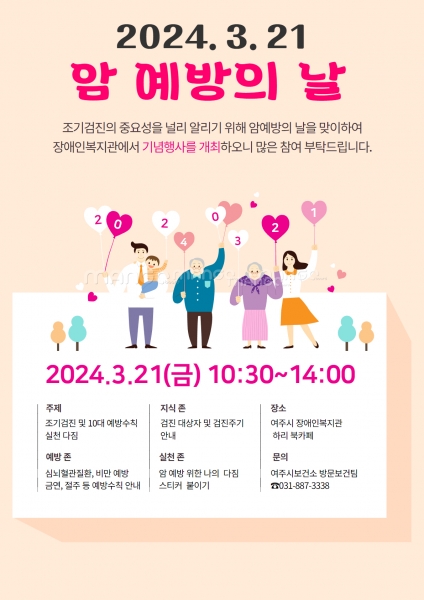 [금요저널] 여주시보건소 건강증진과는 암 예방의 날을 맞이해 암 조기 검진의 중요성을 널리 알리기 위해 다가오는 21일 국민건강보험공단과 함께 여주시장애인복지관 하리 북카페에서 암예방의 날 캠페인을 개최한다.