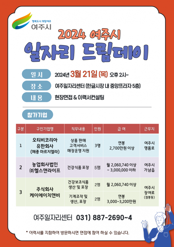 참여를 원하는 구직자는 3월 21일 오후 2시까지 여주 일자리센터로 방문하면 원하는 업무 분야에 1:1 현장 면접과 이력서 컨설팅을 받을 수 있으며 그 밖에 일자리드림데이 관련 자세한 사항은 여주일자리센터로 문의하면 된다.