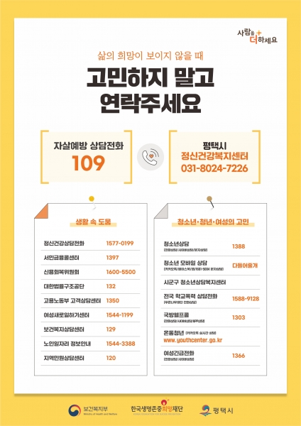 [금요저널] 평택시 송탄보건소 정신건강복지센터는 자살 예방을 위해 자살 고위험 시기인 3~5월을 맞아 집중 안내 및 홍보를 진행한다고 밝혔다.