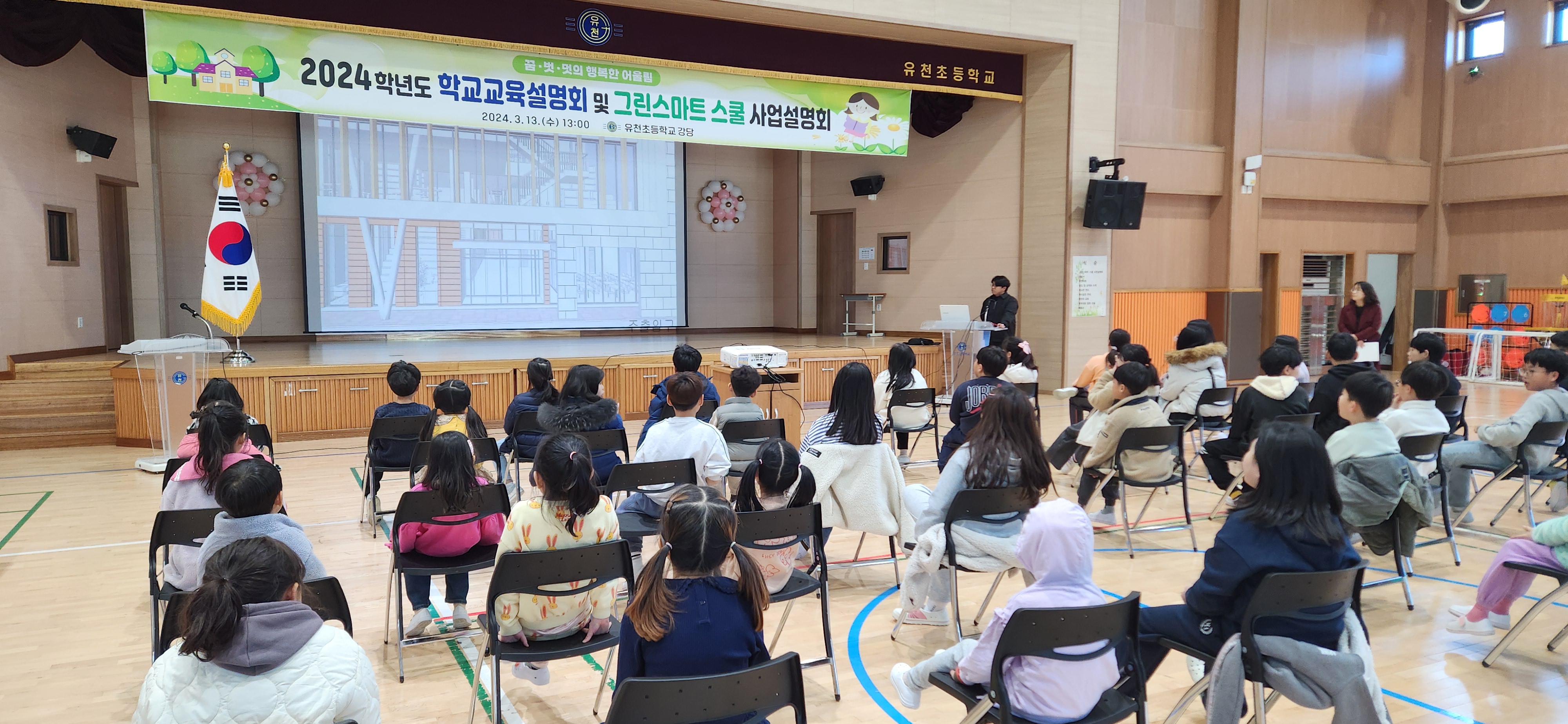 유천초등학교(교장 김윤교)는 2024학년도 그린스마트 스쿨 사업설명회 및 1학기 학교 교육 설명회를 3월 13일(수) 13시 본교 버드내관에서 개최하였다. 본 행사는 1부 그린스마트 스쿨 사업설명회, 2부 학교 교육 설명회로 나누어 진행하였다.