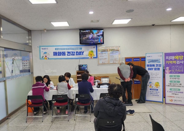 매화동 마을건강복지계획의 하나로 진행 중인 건강데이 사업은 대야동 치매안심센터와 협업해 관내에 거주하는 만 60세 이상의 어르신들을 대상으로 치매 예방 기억력 검사를 병행하고 있다.