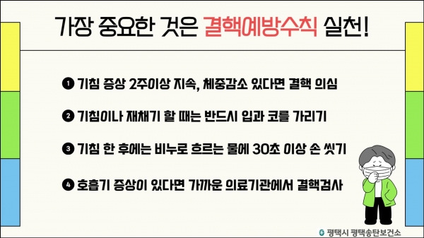 평택보건소 관계자는 “결핵은 예방과 조기 발견이 중요한 질병인 만큼 결핵 예방수칙 실천과 2주 이상 기침이 지속되면 검진을 받는 것이 매우 중요하다”고 당부하며 “유튜브 ‘평택·송탄보건소’을 통해 결핵뿐만 아니라 건강에 대한 유익하고 다양한 정보를 확인할 수 있으니 많은 구독 바란다”고 전했다.