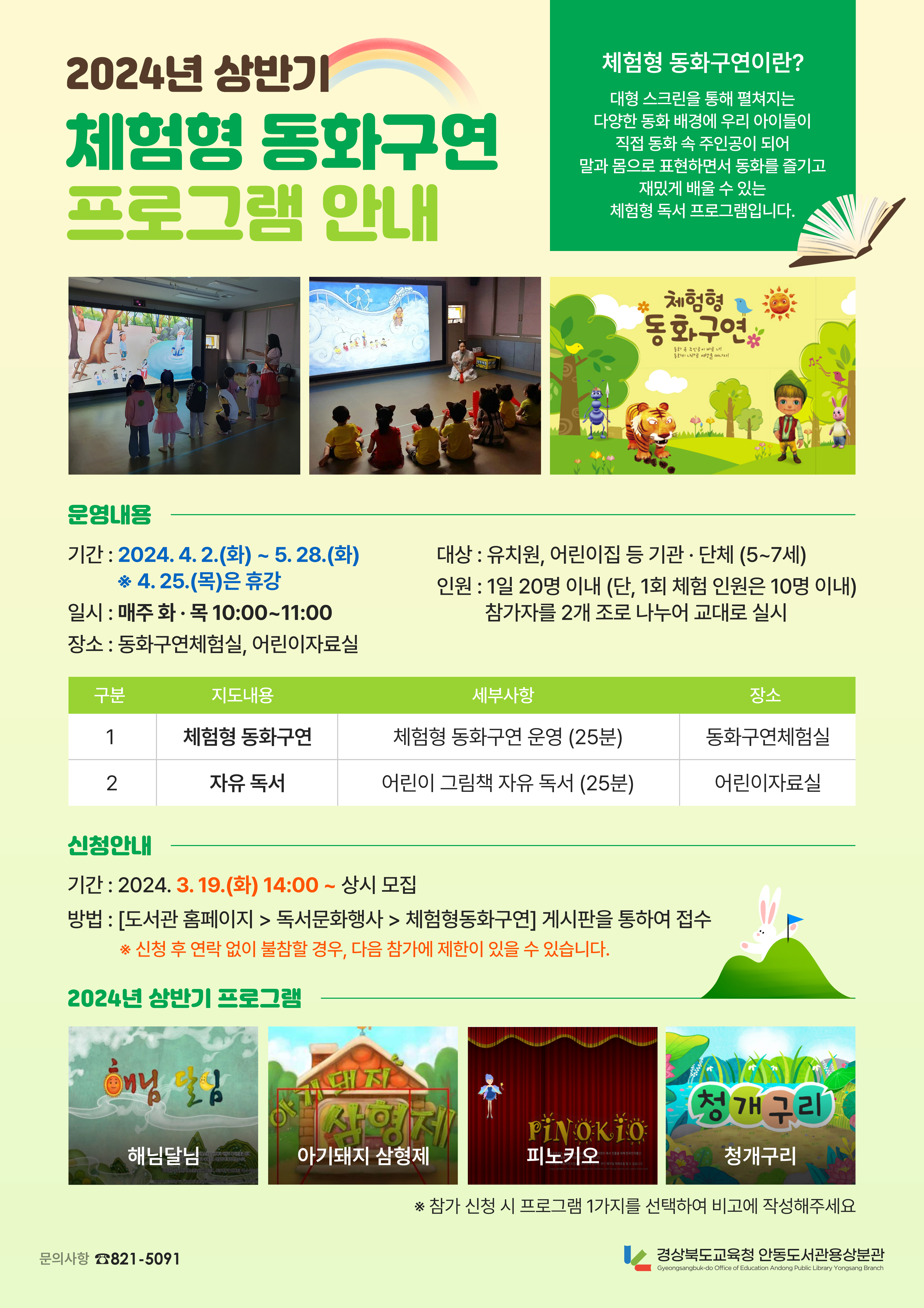 □ △아기돼지 삼형제 △해님달님 △피노키오 △청개구리 4개의 프로그램을 4월 2일(화)부터 5월 28일(화)까지 16회에 걸쳐 운영하며, 모집은 3월 19일(화) 2시부터 용상분관 홈페이지를 통해 선착순 접수를 받는다.