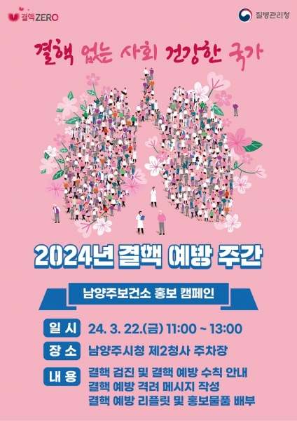 결핵예방 캠페인은 ‘결핵 없는 사회, 건강한 남양주’라는 슬로건을 내걸고 결핵예방 및 관리의 중요성을 알리고 결핵에 대한 경각심을 고취하기 위해 진행된다.
