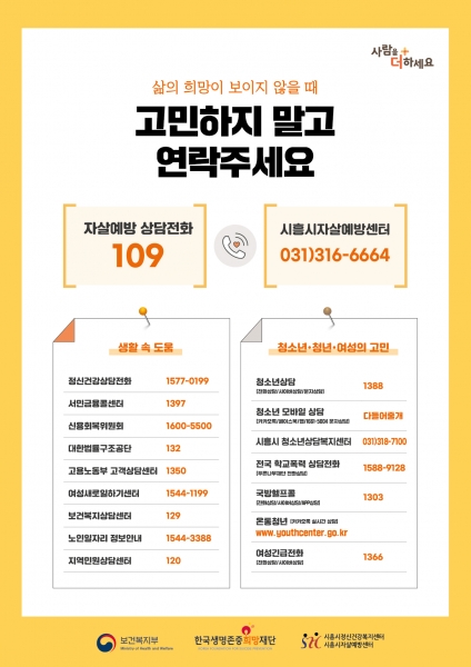 자살 사고 및 위험이 있거나 정신적 어려움을 겪고 있다면 시흥시자살예방센터 누리집이나 자살예방 상담전화, 시흥시자살예방센터 생명존중팀으로 상담을 요청하면 된다.