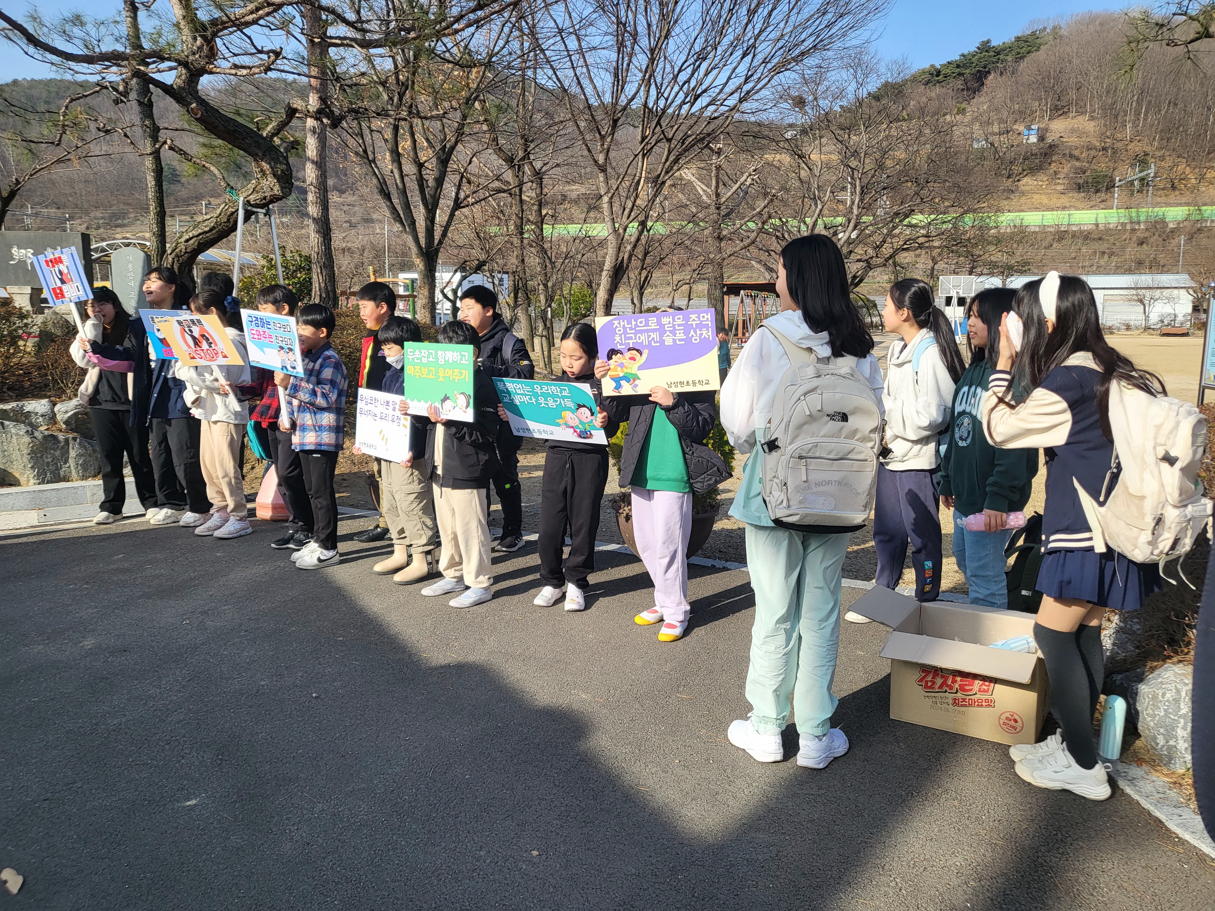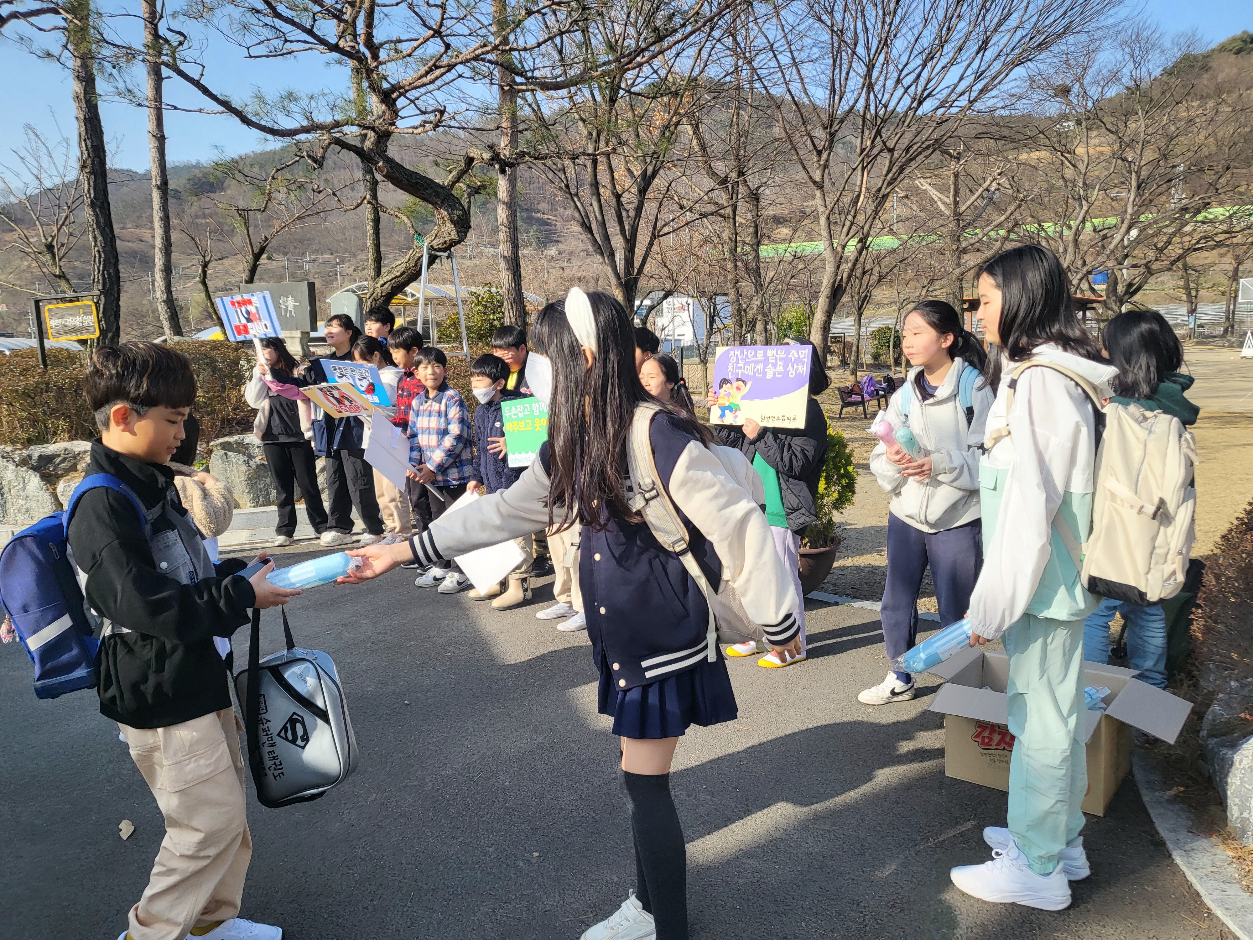 남성현초등학교(교장 최병찬)는 3월 18일(월) 오전 8시 30분부터 9시 까지 정문에서 학생들의 등교시간에 맞추어 새학기 학교폭력 예방 캠페인을 펼쳤다.
