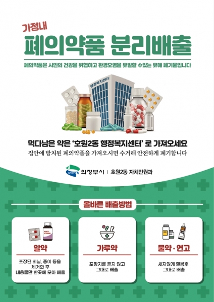[금요저널] 의정부시 호원2동행정복지센터는 가정에서 복용하다 남거나 유통기간이 지난 의약품을 편리하고 안전하게 배출할 수 있도록 ‘폐의약품 수거함’을 운영하고 있다고 19일 밝혔다.