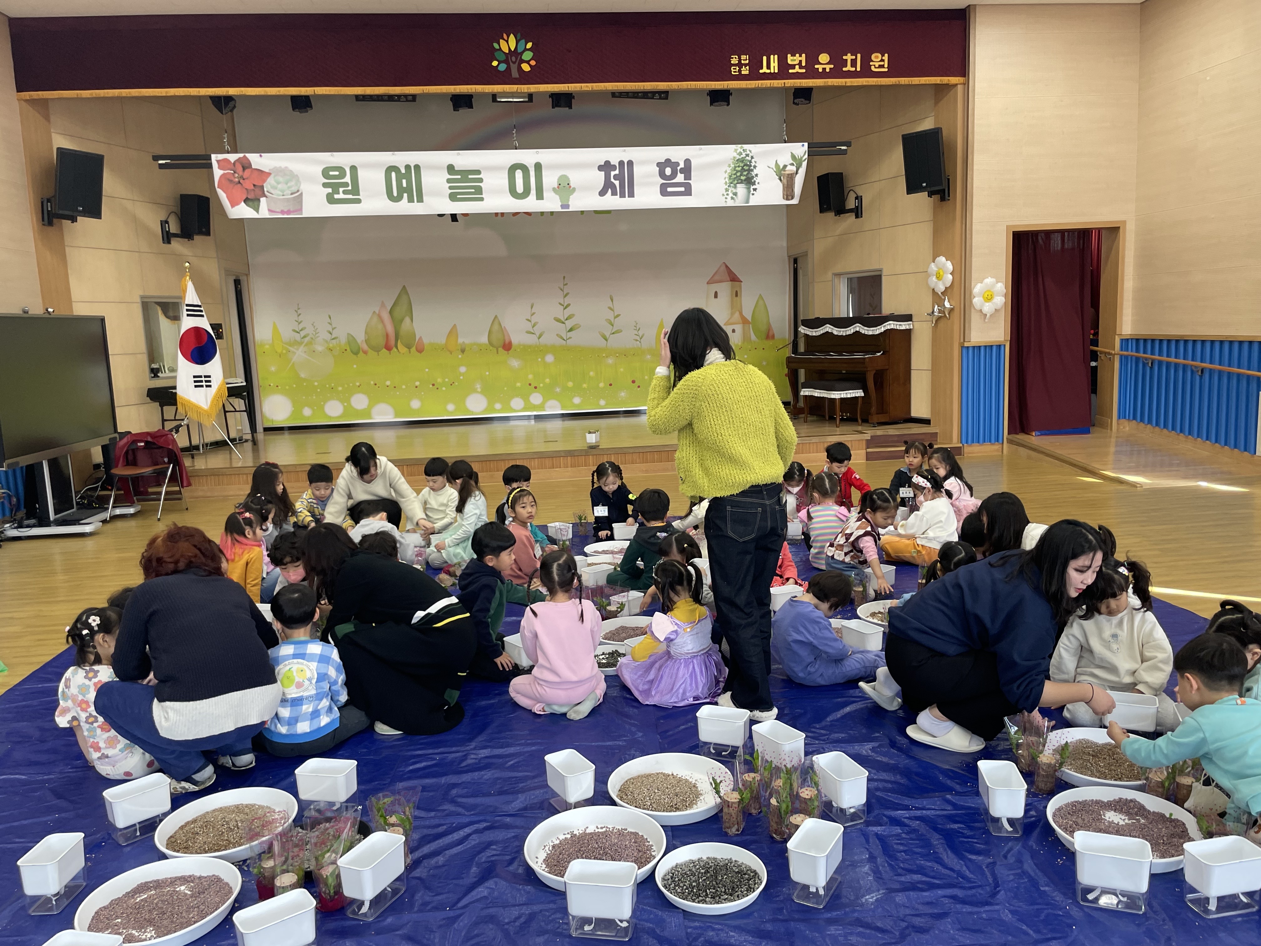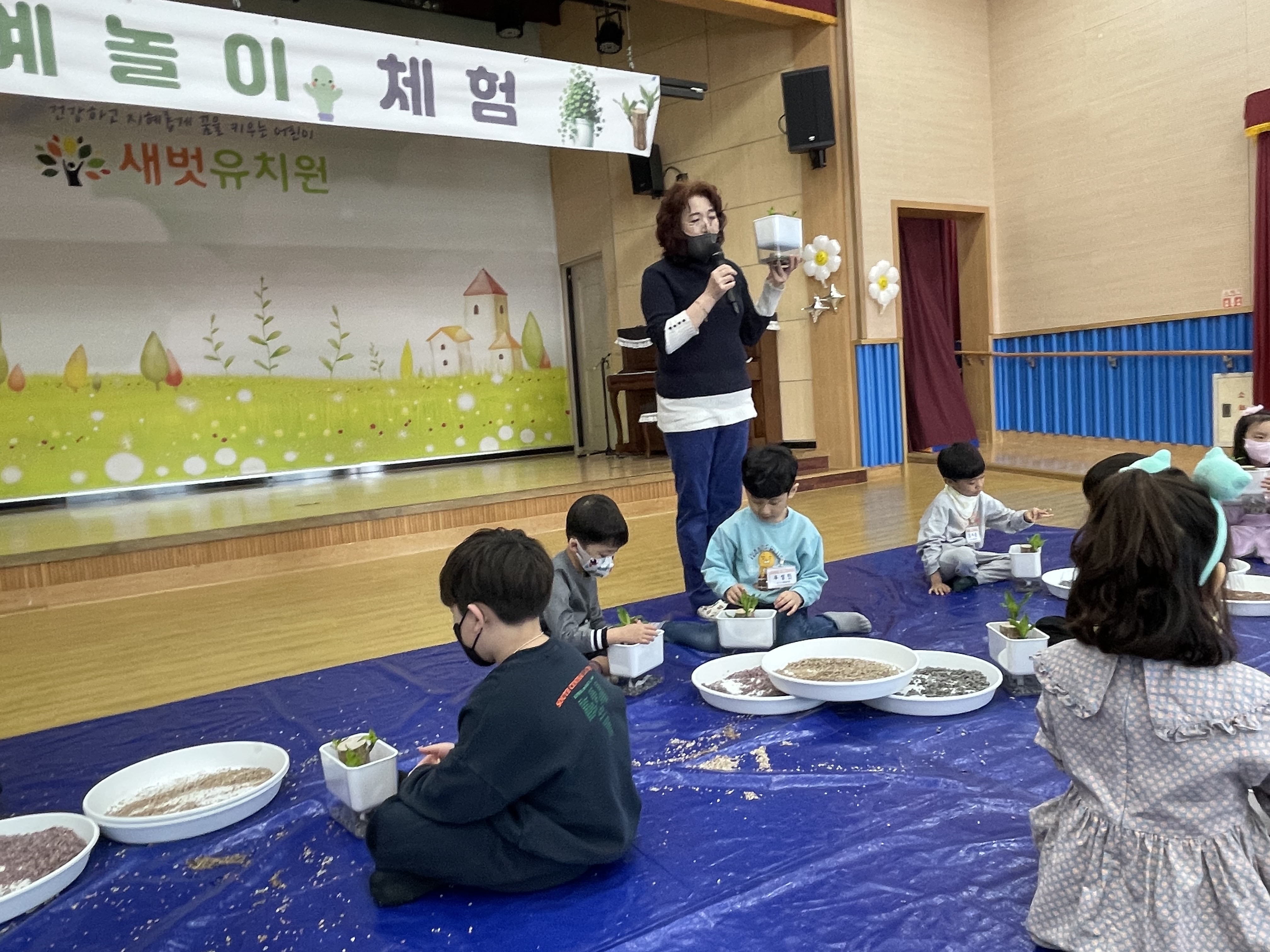 □ 예천군 공립 단설 새벗유치원(원장 우수경)은 3월 18일(월) 유아들의 자연과의 소통을 촉진하고 창의성을 개발하기 위해 ‘원예 놀이체험’을 기획하였다. 원예놀이체험는 새벗유치원의 유아생태교육 프로그램의 일환으로 3층 체육실에서 하루만에 이루어졌다.
