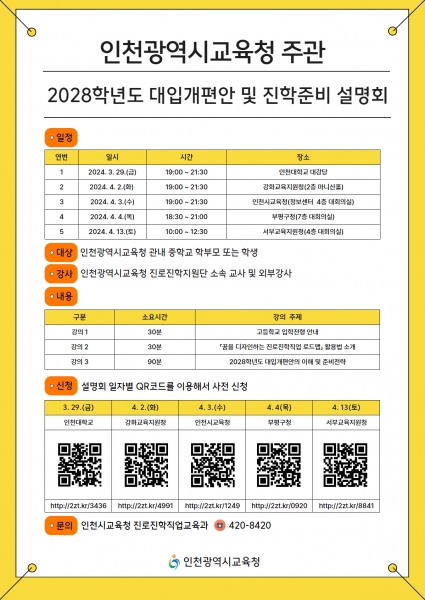 [금요저널] 인천광역시교육청은 관내 중학생과 학부모를 대상으로 2028 대입개편안 설명회를 3월 29일부터 4월 13일까지 총 5회 개최한다.