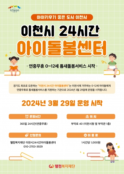 이천시 24시간 아이돌봄센터 운영 지원사업은 영유아부터 초등학생 아이를 둔 이천시 주소를 둔 부모라면 누구든지 이용 가능하며 사랑으로 보듬어 밤에도 안전하게 돌봐 주는 경험 많고 따듯한 전문 보육교사가 상시 대기중이며 이용료는 시간당 1천원으로 직접 방문 및 전화예약 신청 가능하다.