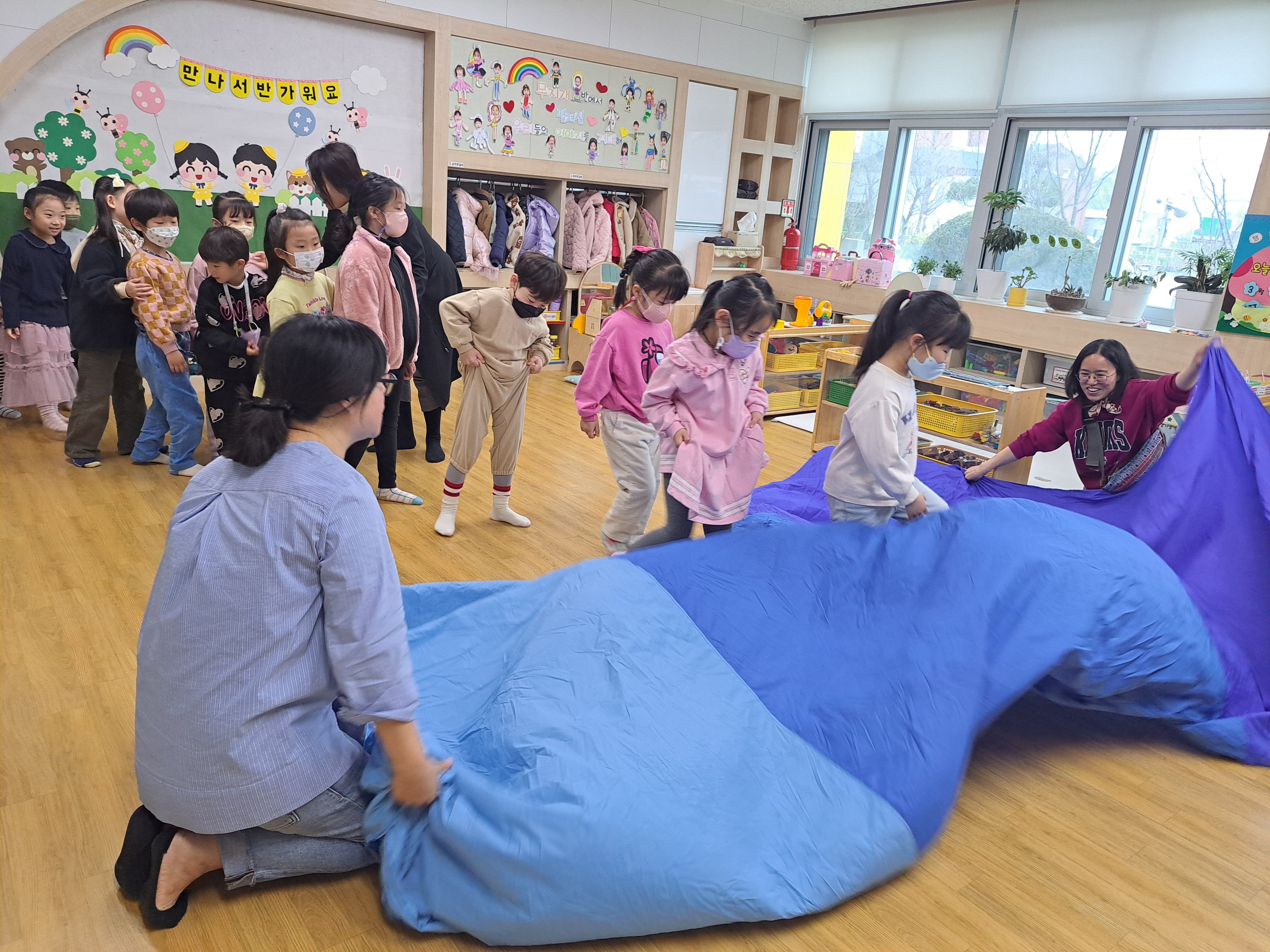 □ ‘산딸기 임금님’라는 동화를 유아들과 함께 보고 이야기를 나눈 뒤에 연극놀이를 시작하였다. “하나, 둘, 셋, 짝(손뼉)”소리에 맞춰 이야기 속으로 들어가 유아들이 극놀이의 주인공이 되는 즐거운 경험을 하였다.