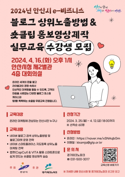 이번 교육은 다음 달 16일 안산시청 대회의실에서 진행되며 ▲네이버 블로그 검색 상위노출 방법 및 블로그 마켓 운영 전략 ▲네이버 스마트 플레이스 지도 등록 상위노출 마케팅 전략 ▲스마트폰으로 쉽게 만드는 숏클립 영상 제작 실습 등의 주제로 진행될 예정이다.