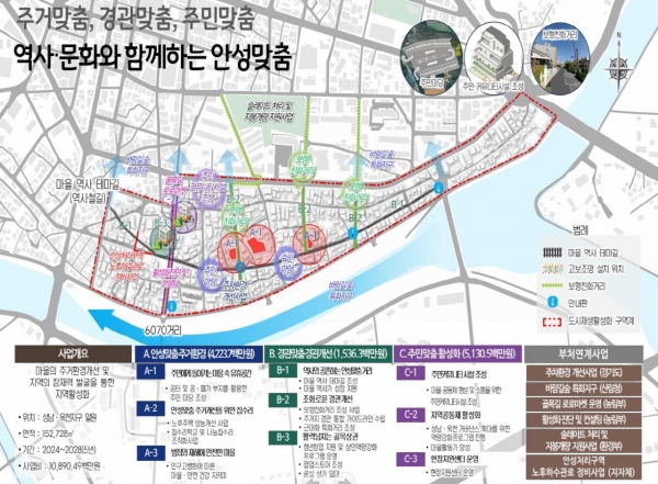 안성시는 “역사·문화가 함께하는 안성맞춤”이라는 비전을 기반으로 ‘안성맞춤 주거환경, 경관맞춤 경관개선, 주민맟춤 활성화’라는 목표 아래 집수리 정비사업, 가로환경 개선사업, 거점시설 조성사업, 상권 및 공동체 활성화 사업 등 재생사업을 추진 할 계획이다.