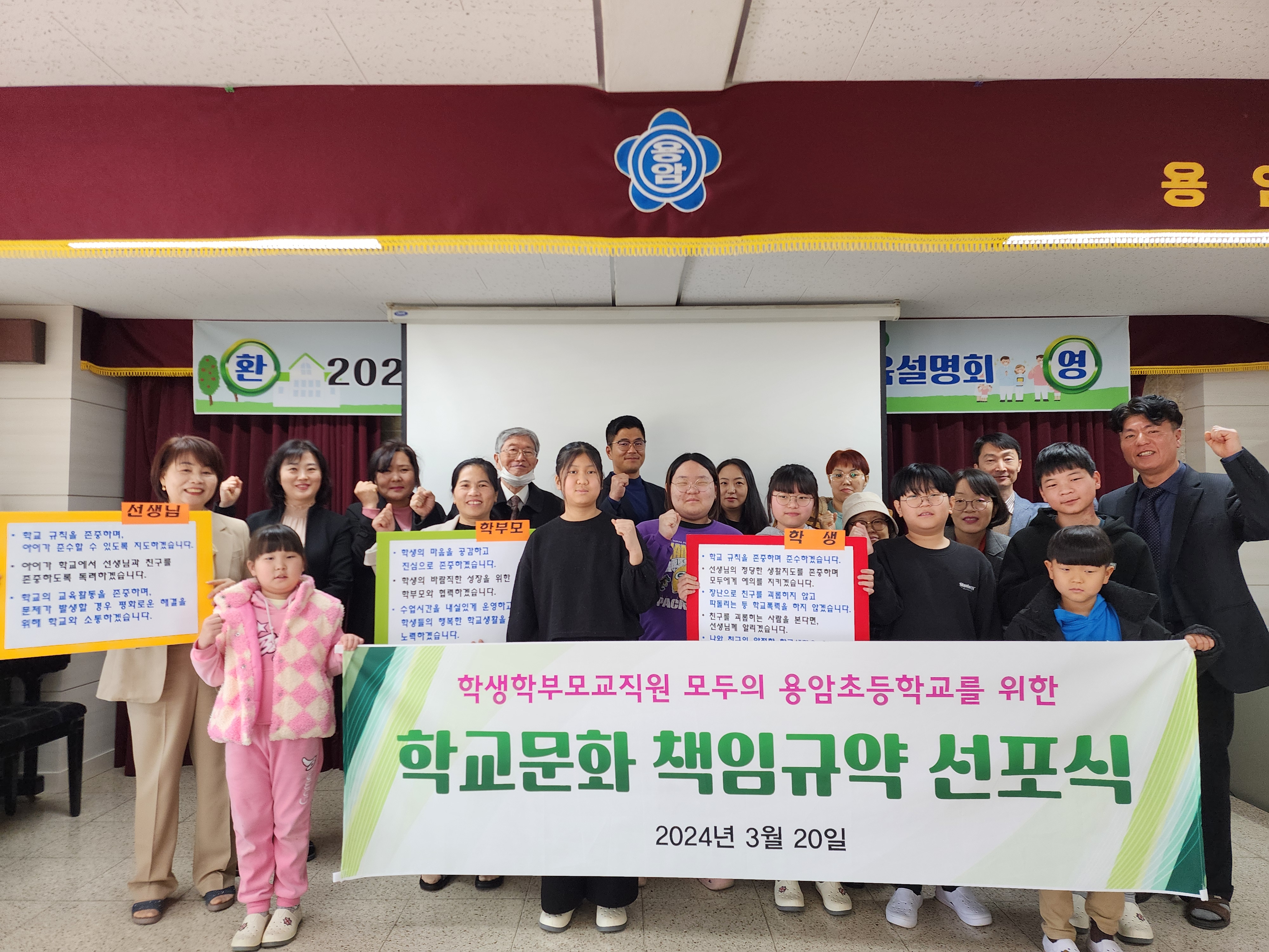 이번 학교교육설명회에는 2023학년도 교육성과와 더불어 2024학년도 학교교육 계획을 설명하고, 학생․학부모․교직원이 학교폭력 및 학교의 생활지도에 대한 이해도를 제고하고 각자의 책임 의식을 확립하고 실천함으로써 모두의 학교를 만들자는 ‘학교문화 책임규약 선포식’도 병행 실시하였다.