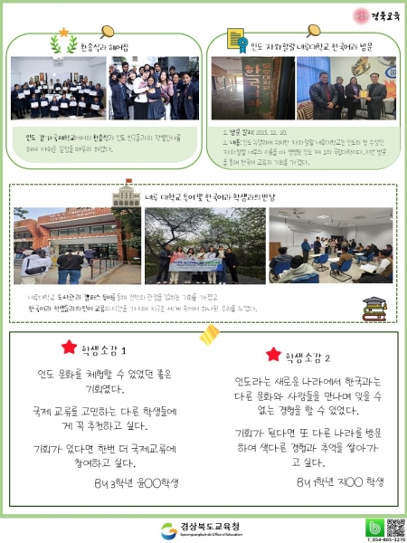 소식지를 통해 인도 학생들과 언어 교류의 시간을 가지며 지구촌 세계 속에서 하나 된 경북교육을 느낄 수 있다.