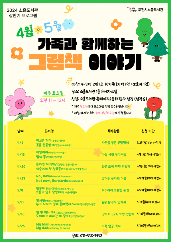 [금요저널] 포천시는 오는 4월 6일부터 7월 13일까지 매주 토요일 총 15회에 걸쳐 소흘도서관 어린이 자료실에서 독서 문화 확산을 위한 ‘가족과 함께하는 그림책 이야기’ 프로그램을 실시한다.