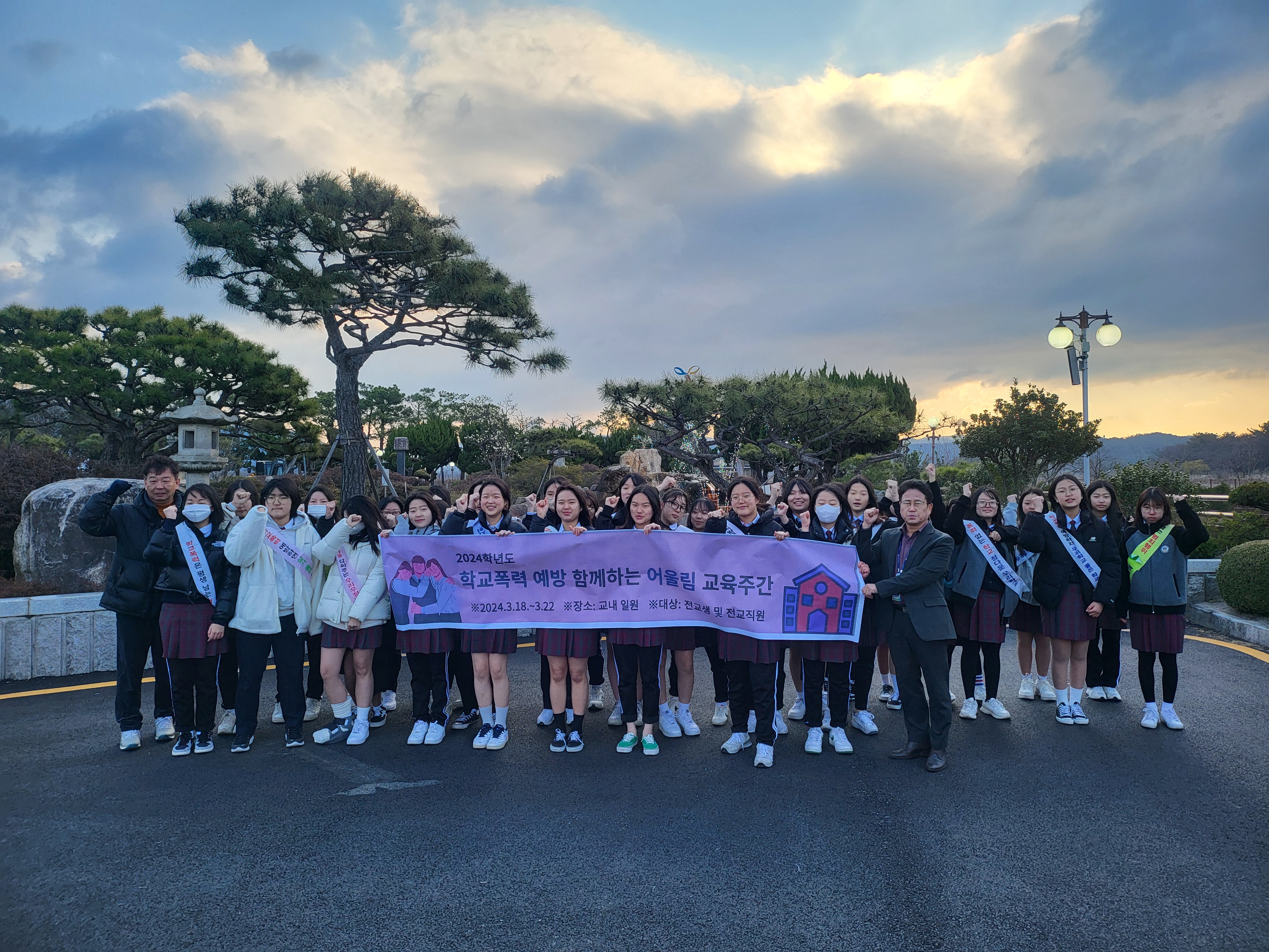 20일에는 아침 등교 맞이 시간에 학생자치회와 연계해 ‘행복한 학교! 함께 나누고, 함께 만들어가자!’라는 슬로건으로 피켓을 들고 학교폭력예방 캠페인을 실시했다. 학생들을 맞이하는 등굣길에서 다함께 슬로건을 외치며 학생들이 학교폭력 예방을 앞장설 것을 독려했다.