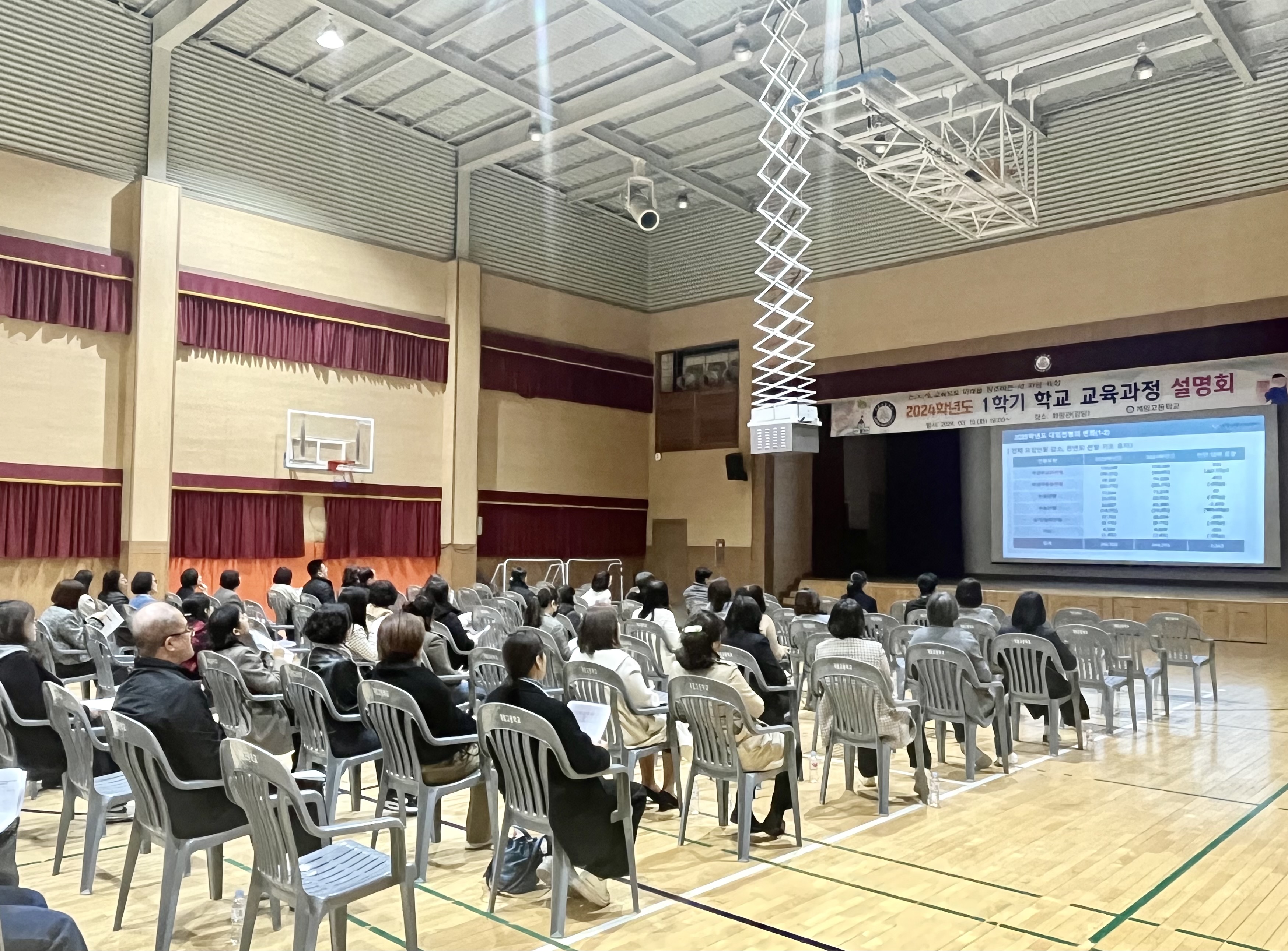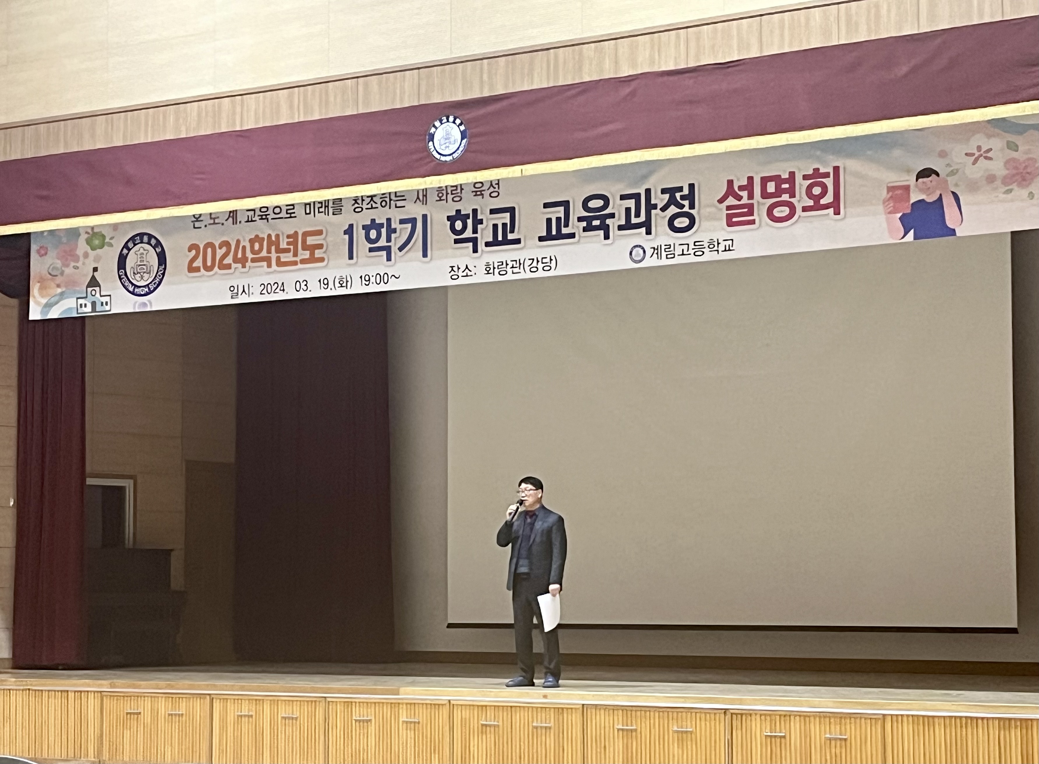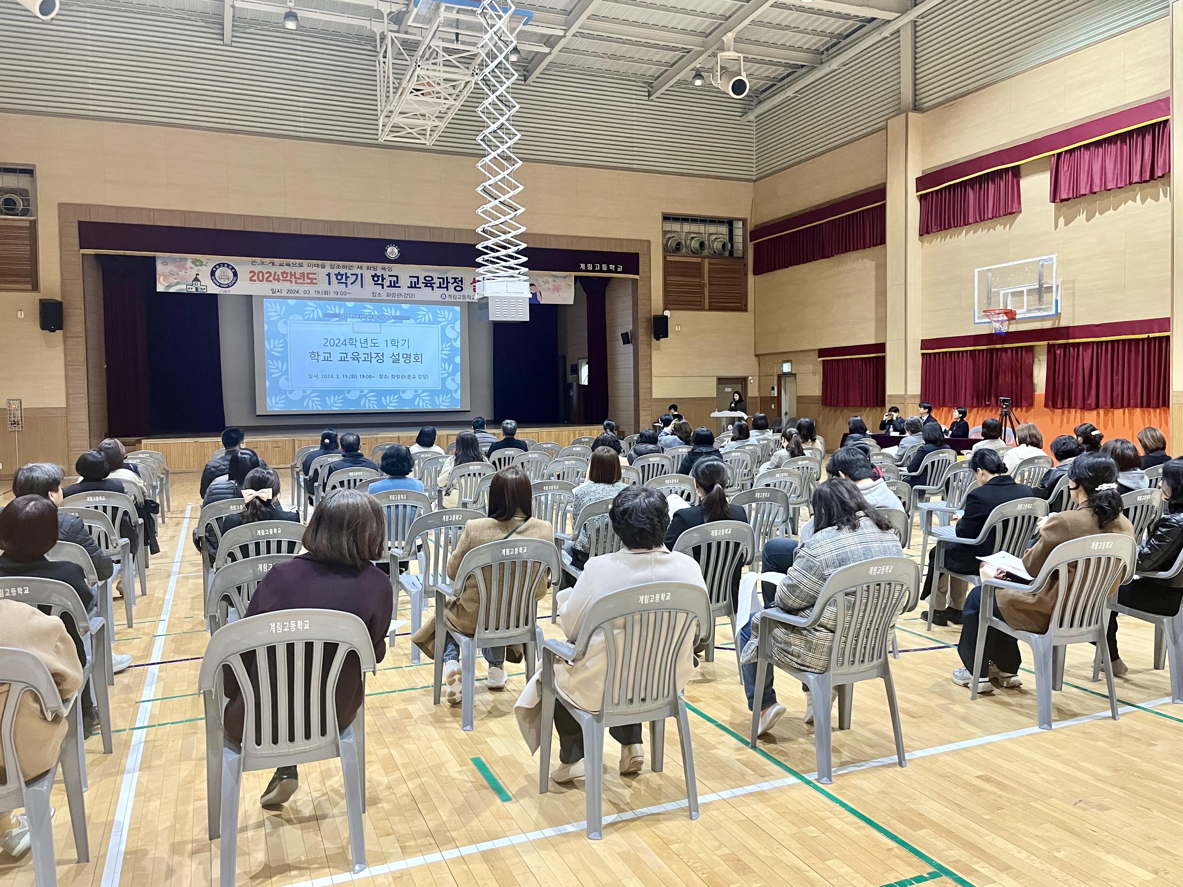 □ 계림고등학교(교장 남준모)는 3월 19일(화) 19시 화랑관(본교 강당)에서 1학기 학교 교육과정 설명회를 개최하였다. 추운 날씨에도 늦은 시간까지 많은 학부모가 참석하여 본교 교육에 대한 뜨거운 관심을 보여주었다.